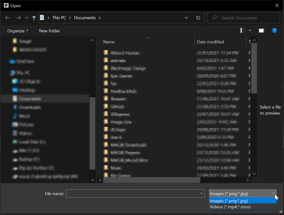 Cela se traduira par l'ouverture de la boîte de dialogue "Ouvrir un fichier" en utilisant *.png,*.jpg,*.mov,*.mp4 comme filtres.