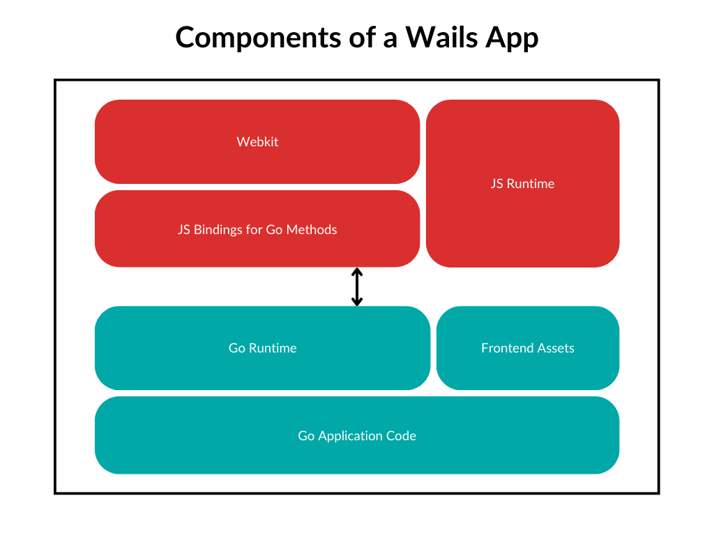 Wails 应用程序是一个带有一个 webkit 前端的标准的 Go 应用程序。 应用程序的 Go 部分由应用程序代码和一个运行时库组成, 该库提供了许多有用的操作,例如控制应用程序窗口。 前端是一个 webkit 窗口,将显示前端资源。 前端还可以使用运行时库的 JavaScript 版本。 最后,可以将 Go 方法绑定到前端,这些将显示为可以调用的 JavaScript 方法,就像它们是原生 JavaScript 方法一样。